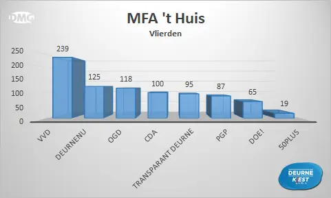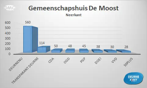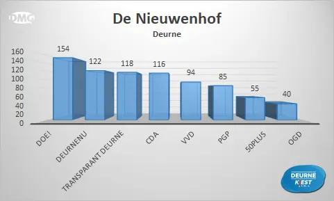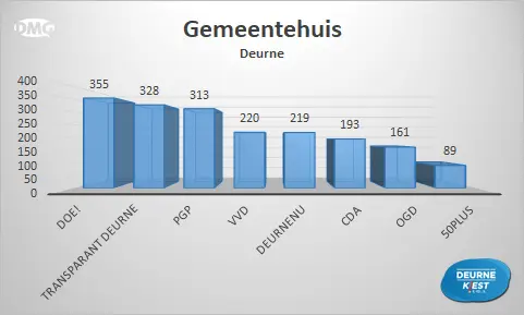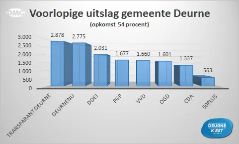 Gemeten over de hele gemeente werd DeurneNU na Transparant Deurne de nummer 2 met 2.775 stemmen. Derde werd DOE! met 2.031 stemmen. Die laatste partij werd vier jaar geleden nog eerste en verliest ten opzichte van de vorige verkiezingen 1.377 stemmen.