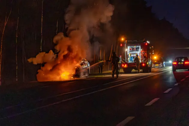 Het overige verkeer werd om het brandende voertuig heen geleid en ondervond weinig hinder. Het is nog onduidelijk hoe de brand is ontstaan. Een bergingsbedrijf komt de auto wegslepen.