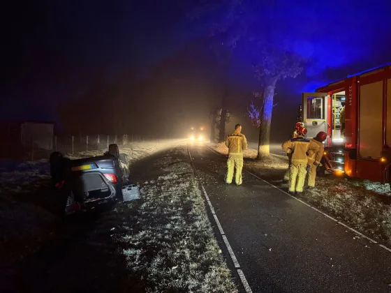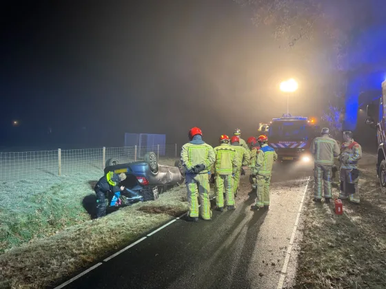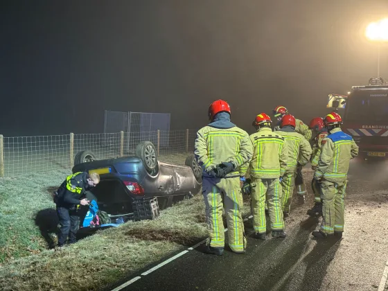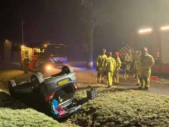 Auto slaat over de kop in Bakel; brandweer bevrijdt bestuurster uit voertuig via kofferbak