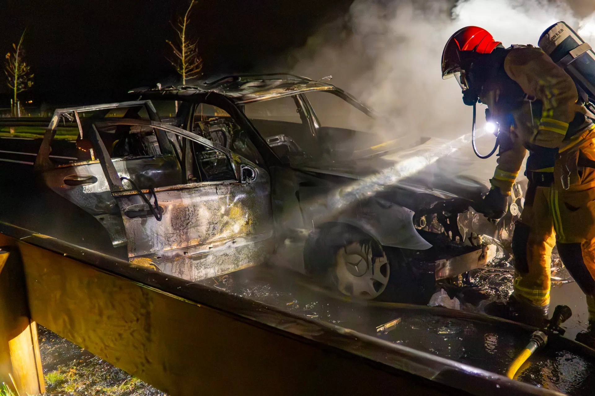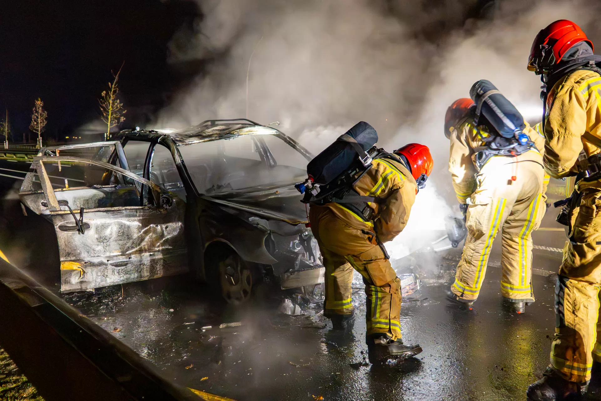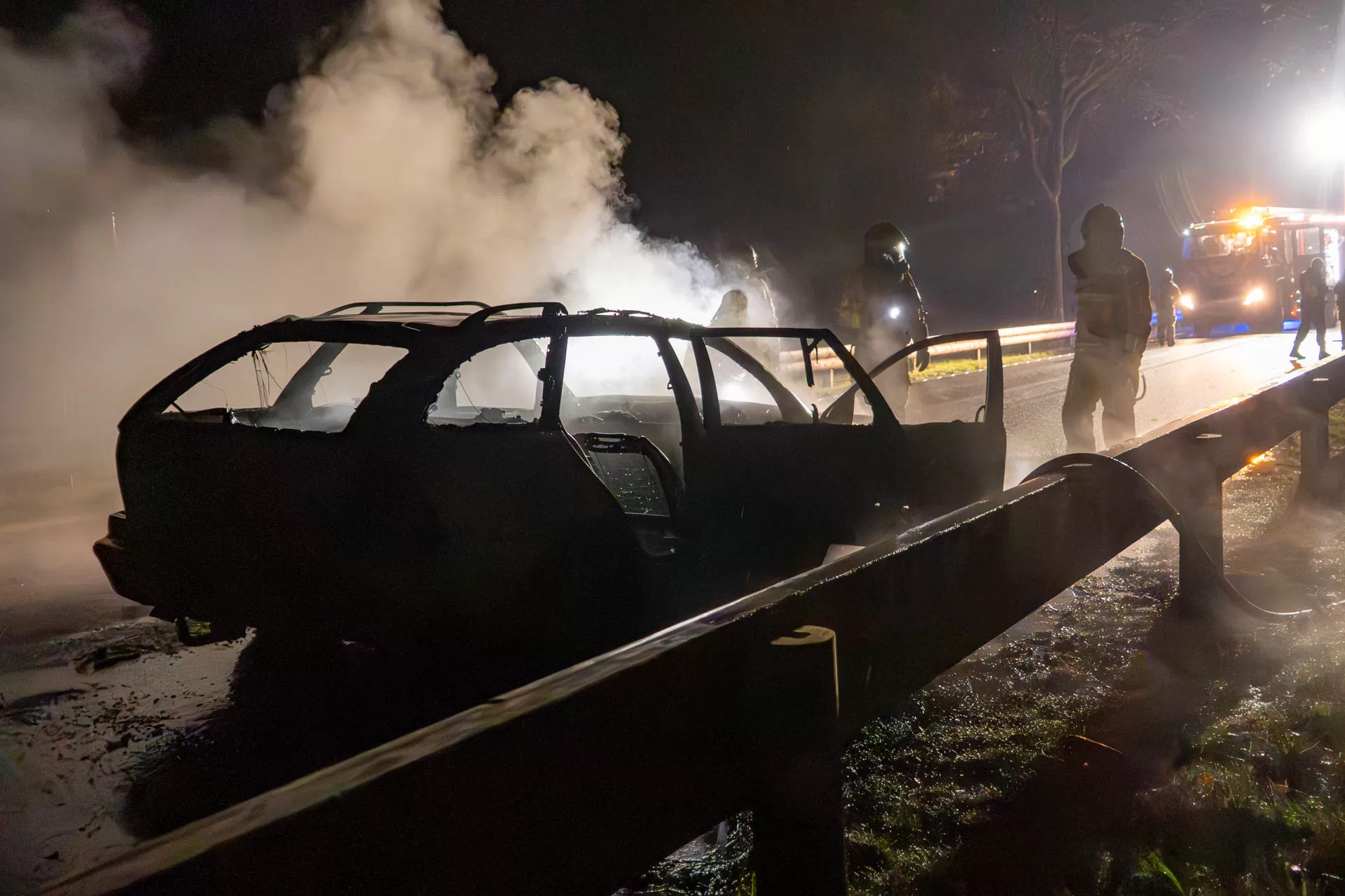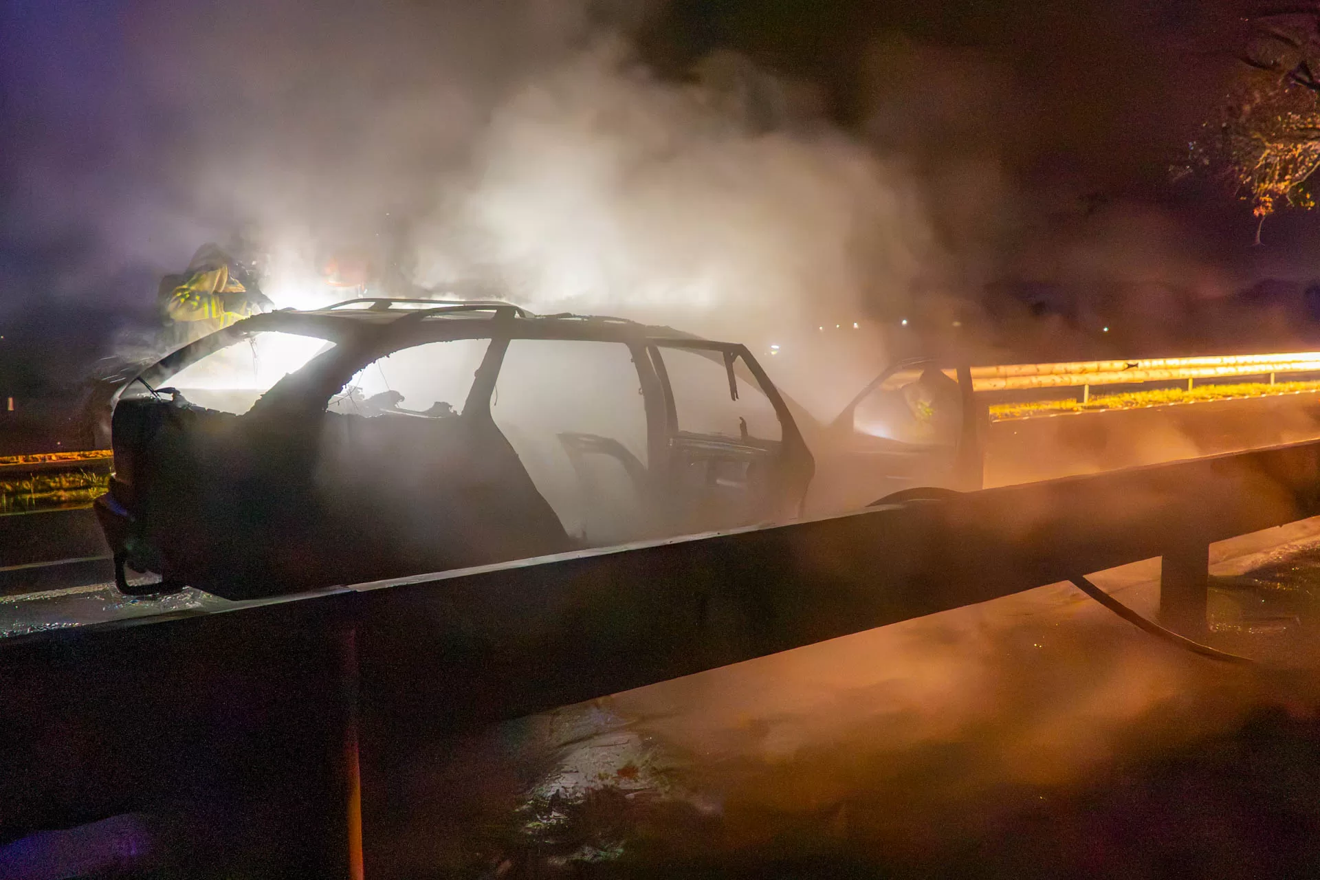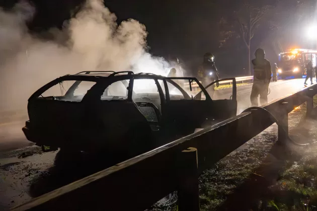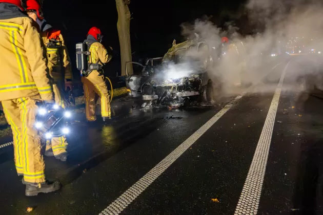 De straat werd tijdelijk afgesloten in beide richtingen. Verkeer werd over de ventweg langs de brandende auto geleid. De oorzaak van de brand is nog onduidelijk.