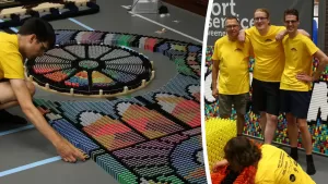 Dit keer had het project als thema: ‘Milestones’, vanwege het 15-jarig jubileum van het Nederlandse Domino Team. Daarnaast werden vijf sub-thema’s verwerkt in het immense bouwwerk, die verschillende momenten uit de geschiedenis belichten. In de video die vrijdagavond online komt, zijn onder andere bijzondere sportprestaties uitgebeeld. “Zoals de Fosbury Flop, de meeste doelpunten in het voetbal en de Triple Crown, die slechts één coureur ooit heeft bereikt”, leggen vader en zoon uit.
