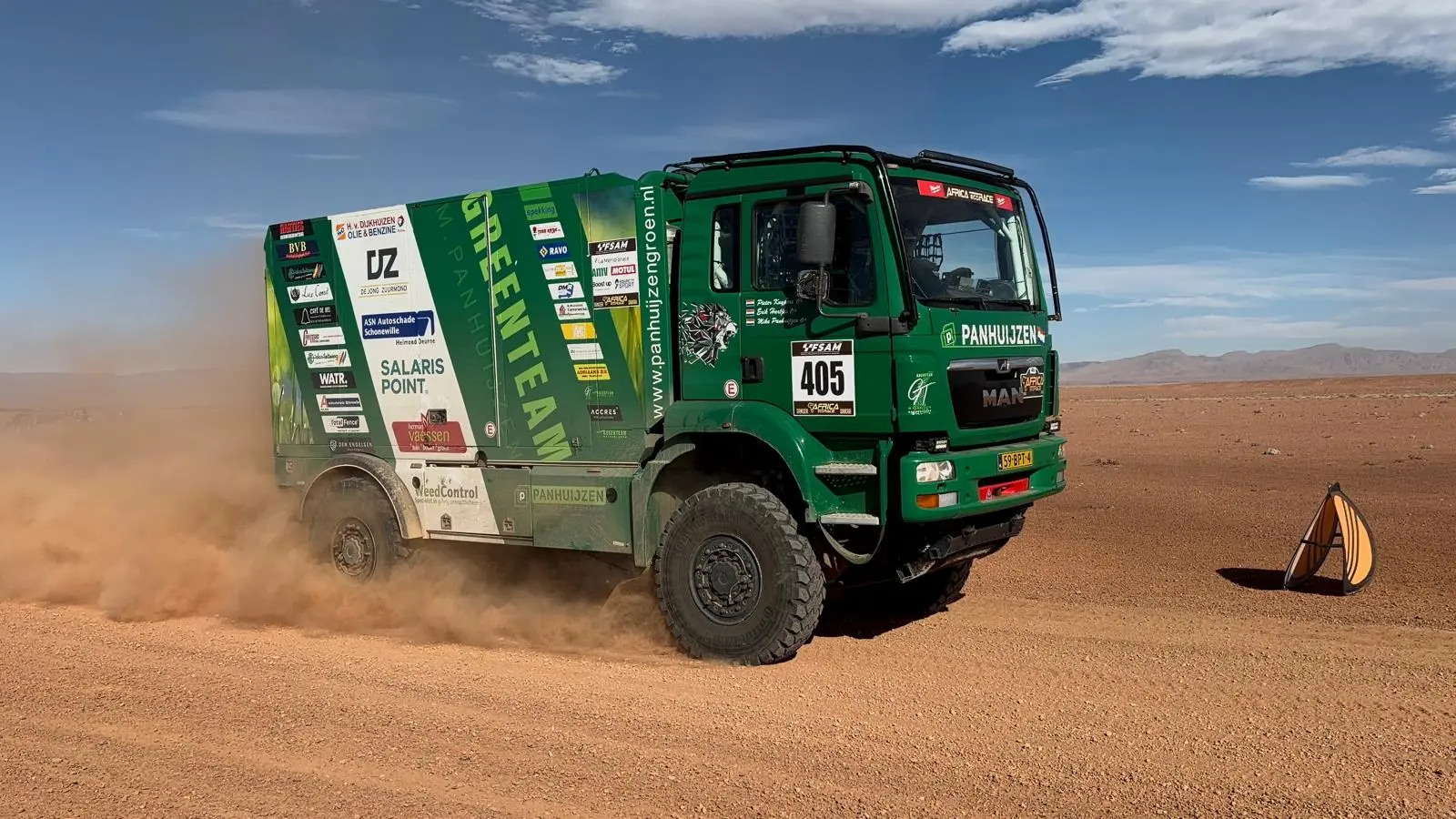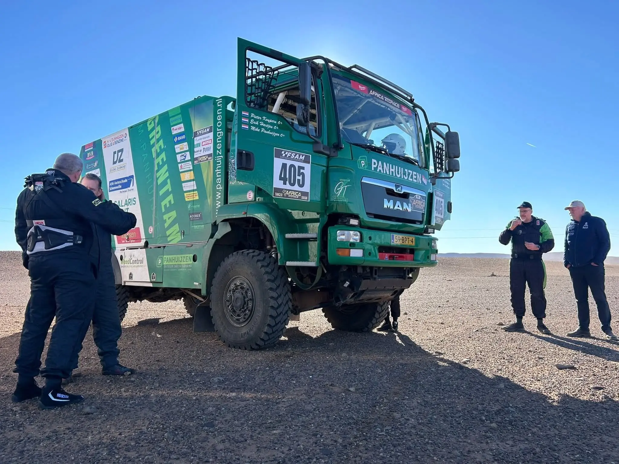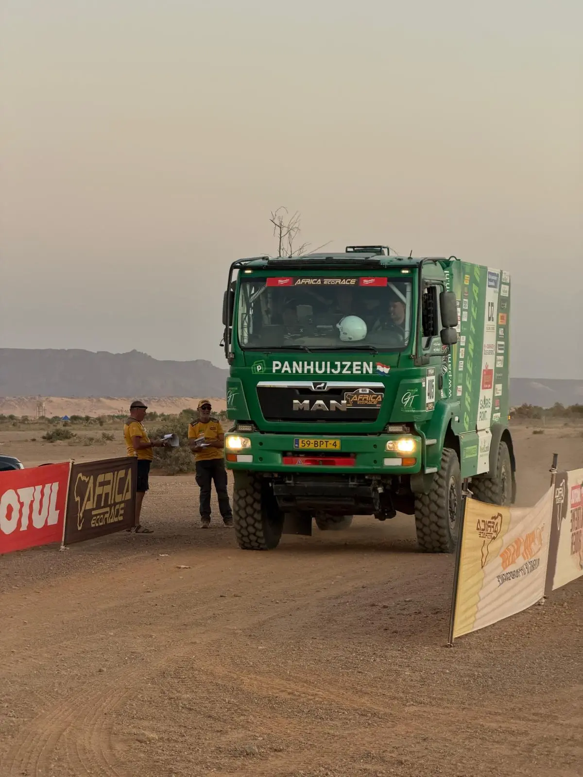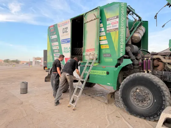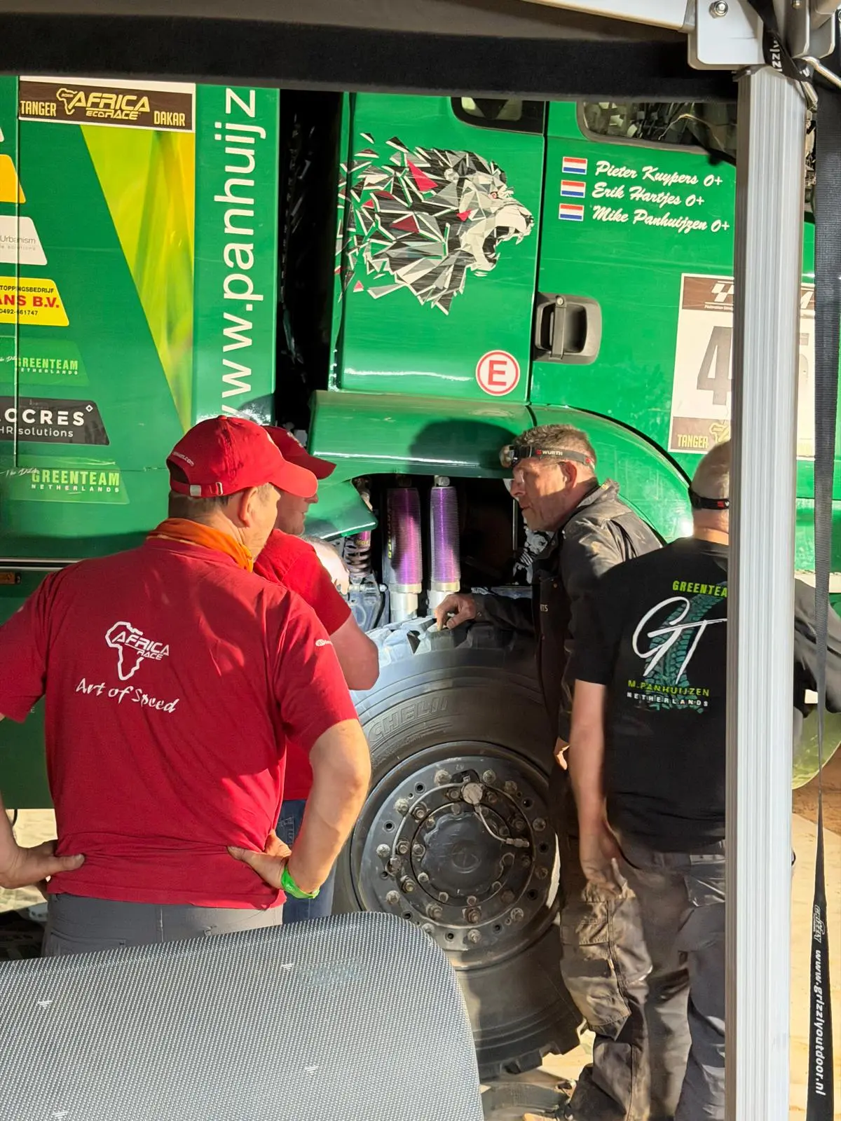Daarbij heeft het Greenteam ook menig keer anderen moeten helpen die vast kwamen te zitten. Het ruige terrein zorgde ook voor de nodige lekke banden, maar daar waren Panhuijzen, Kuypers en Hartjes met hun team op voorbereid. De MAN-truck hield het goed uit tijdens de zeventiende editie van de Africa Eco Race en dat betekende weer wat minder werk voor de monteurs.