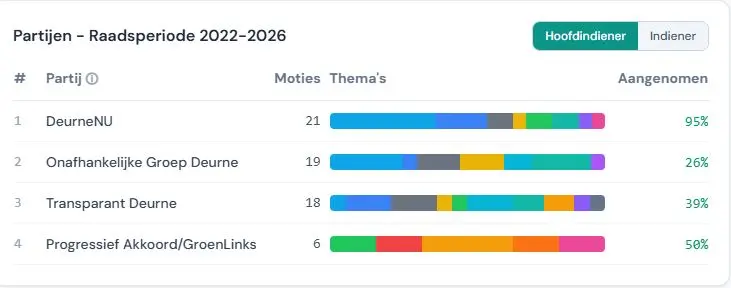Ga je kijken naar welke partij de meest succesvolle ideeën heeft ingebracht, dan scoort politieke partij DeurneNU het beste. Van de 21 moties die deze fractie als hoofdindiener heeft aangedragen, zijn er twintig aangenomen. Dit betekent dat 95 procent van de voorstellen werd omarmd door de raad.