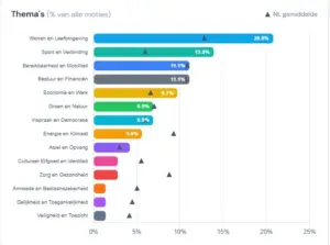 De meeste moties in Deurne werden in de afgelopen raadsperiode ingediend over het onderwerp ‘Wonen en Leefomgeving’. Daarna volgen ‘Sport en Verbinding’ en ‘Bereikbaarheid en Mobiliteit’.