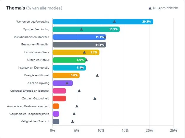 Dat blijkt uit een inventarisatie door onderzoekers van de Erasmus Universiteit in Rotterdam. Zij pluisden uit hoeveel moties er van 2022 tot 2026 werden ingediend in bijna alle gemeenten van Nederland. Ook onderzochten ze over welke onderwerpen die gingen en hoeveel van die voorstellen uiteindelijk door de gemeenteraad worden aangenomen.