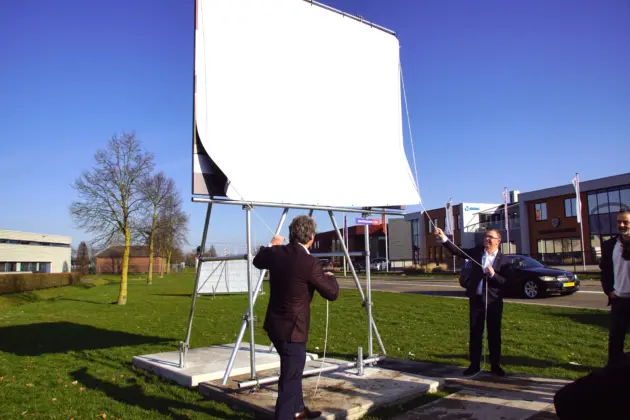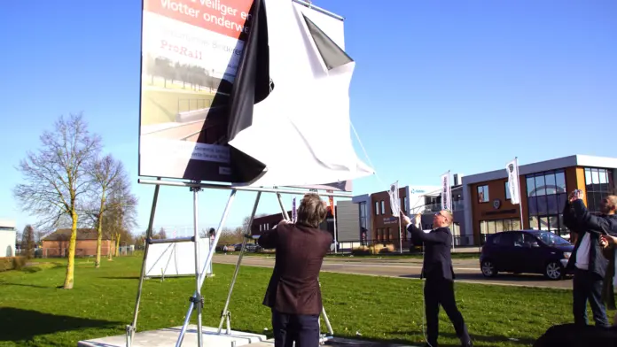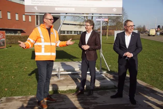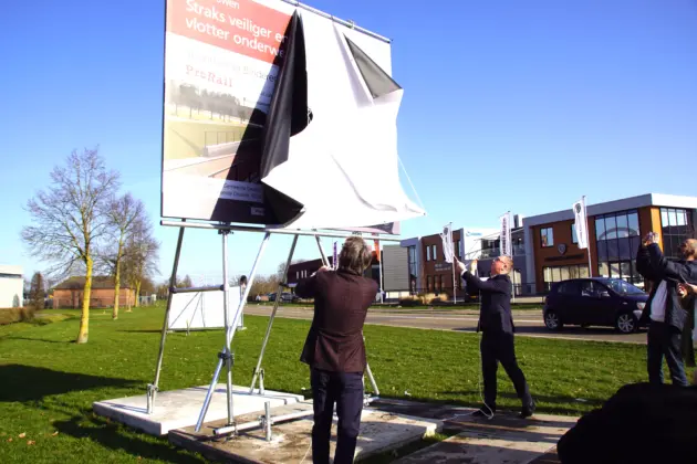 Eerste zichtbare teken van spoortunnel Binderendreef; wethouder Helm Verhees onthult bouwbord