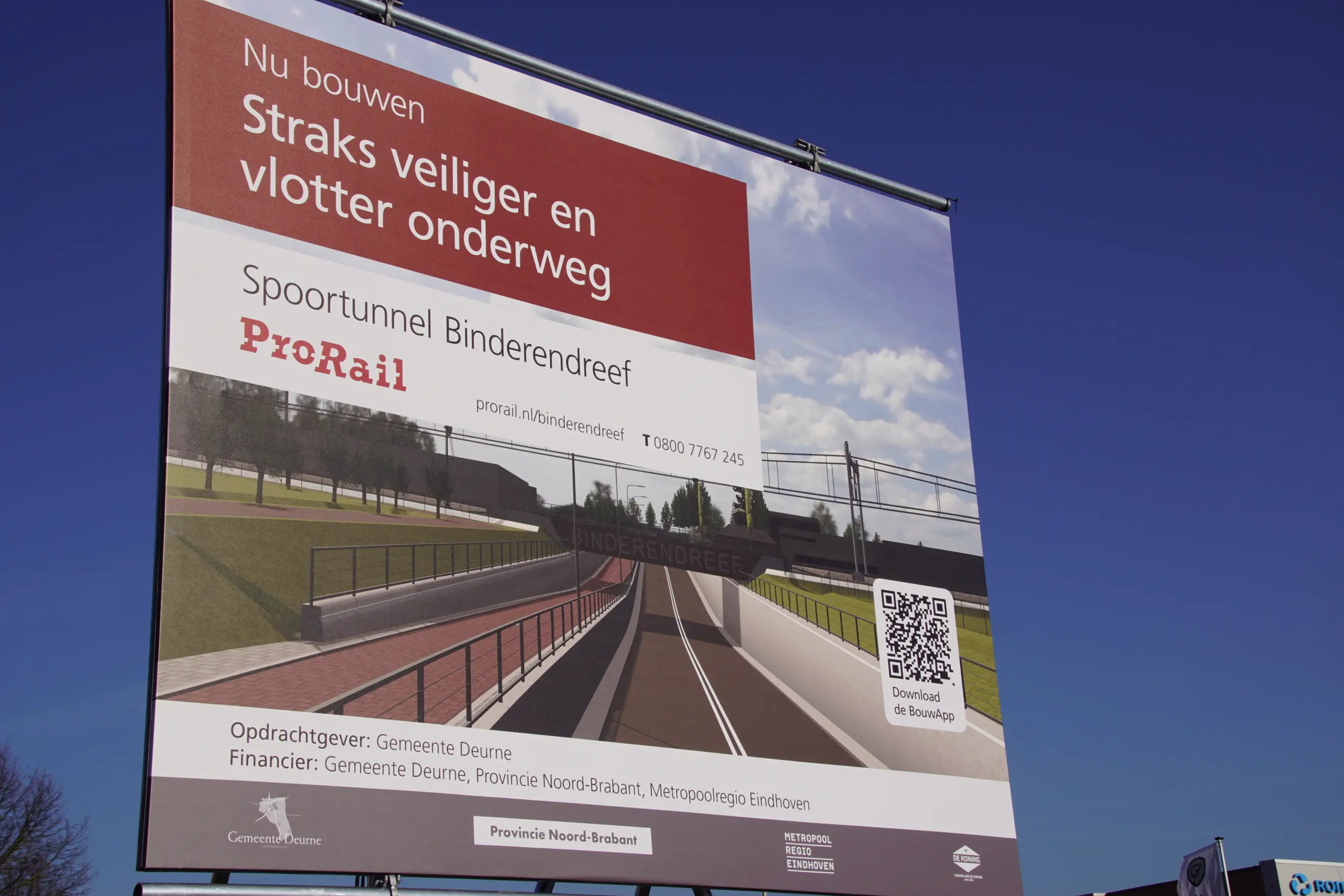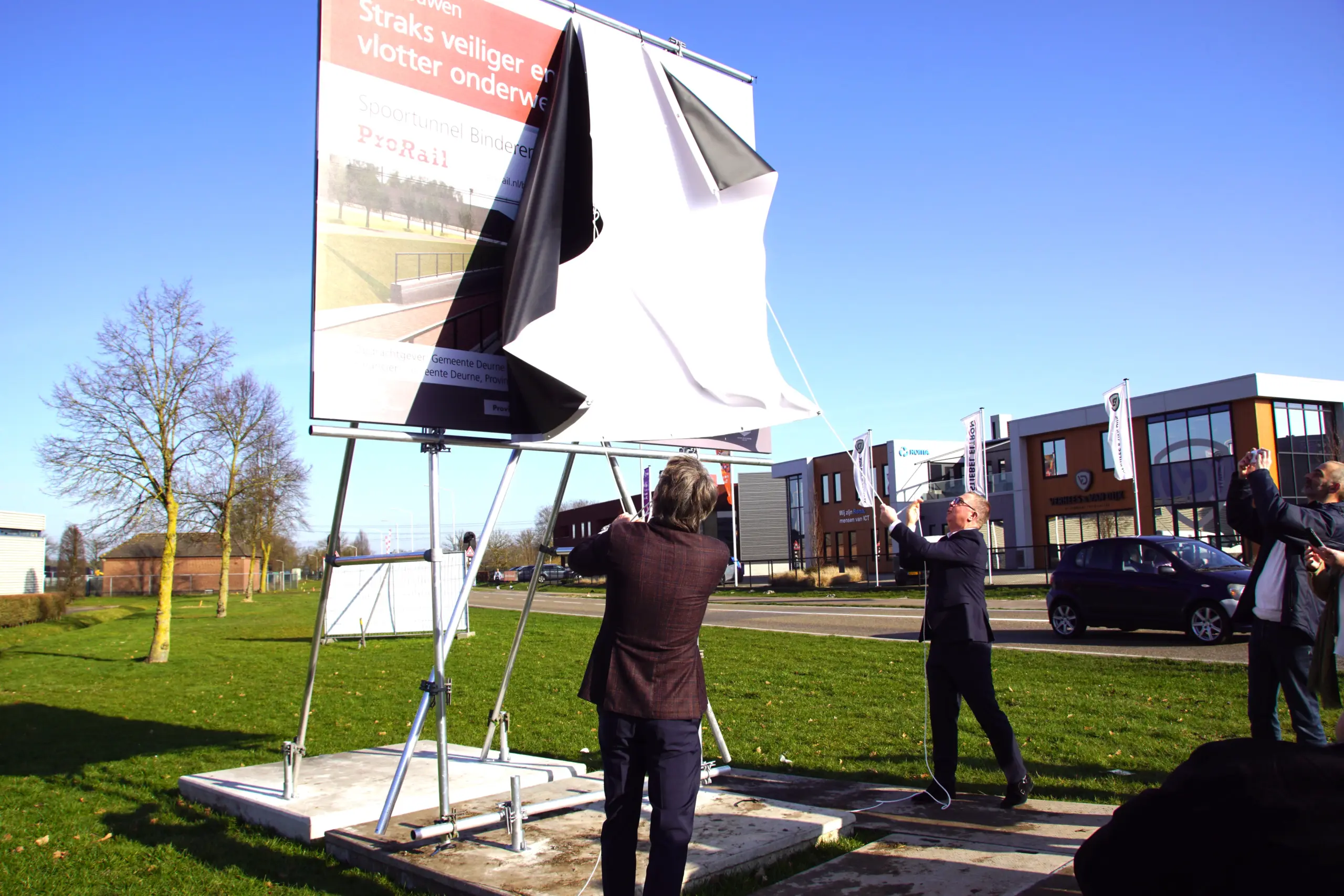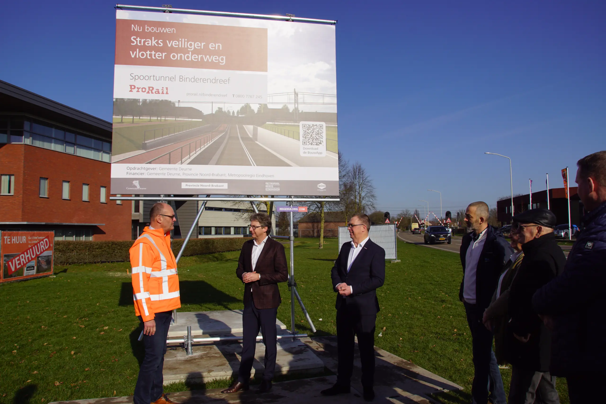 Het duurt nog even voor er daadwerkelijk verkeer door de nieuwe spoortunnel in Deurne kan rijden. Toch is er sinds vrijdagochtend al wel het eerste zichtbare teken van de onderdoorgang op de Binderendreef te zien. Wethouder Helm Verhees en ProRail-regiodirecteur Dimitri Kruik onthulden samen een bouwbord. Het staat symbool voor het begin van de ingreep die lang op zich heeft laten wachten.