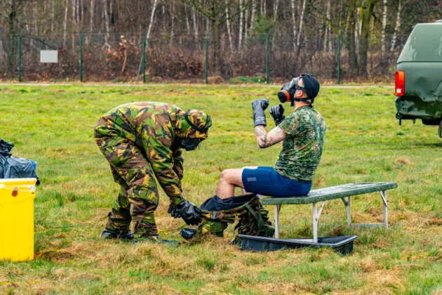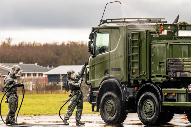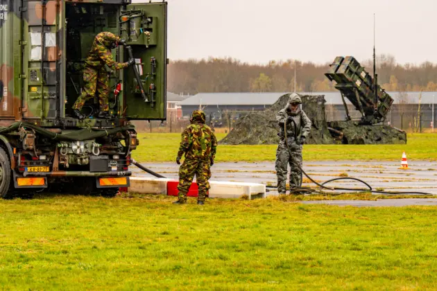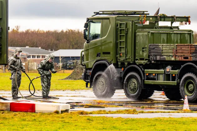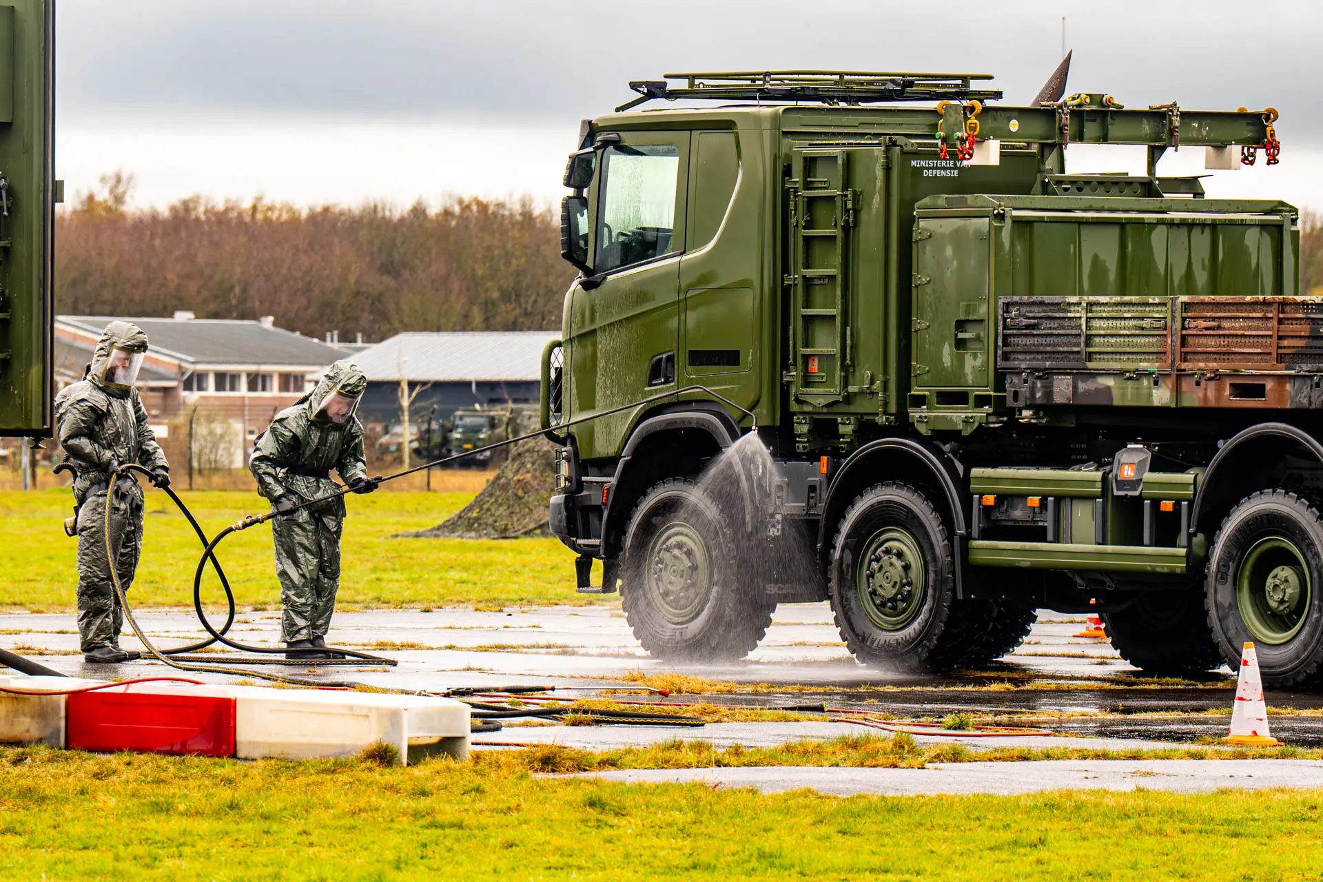 Op het terrein van de Luitenant-generaal Bestkazerne in Vredepeel was woensdag een bijzonder tafereel te zien. Bij de thuisbasis van het Defensie Grondgebonden Luchtverdedigingscommando (DGLC) wemelde het van de militairen in speciale beschermingspakken, die druk bezig waren met ontsmettingswerkzaamheden. Het ging om een grootschalige oefening, waarbij een chemische aanval werd gesimuleerd.