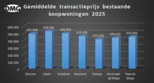 Ook in andere gemeenten in de regio komt de woningprijs in 2025 uit in de buurt van de vijf ton. In Someren ligt de gemiddelde verkoopprijs nog net onder dat bedrag met 498.000 euro. Voor een woning in Asten betaalde je vorig jaar 528.000 euro. Een stuk goedkoper zijn de bestaande huizen in Helmond. Daar ligt het gemiddelde op 459.000 euro.