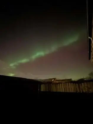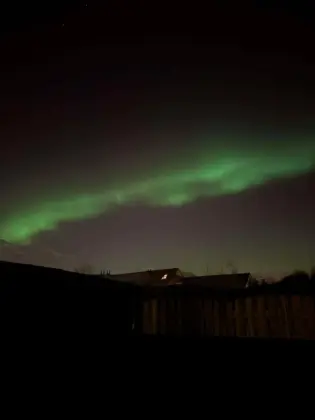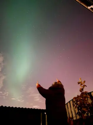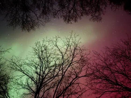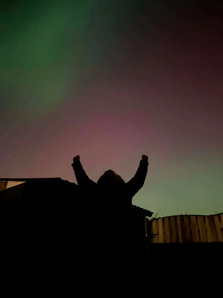 De gekleurde gloed die je ziet in de lucht, ontstaat doordat elektrisch geladen deeltjes van de zon met hoge snelheid tegen de atmosfeer botsen. Dat geeft de roze, paarse en groene lichtverschijnselen.