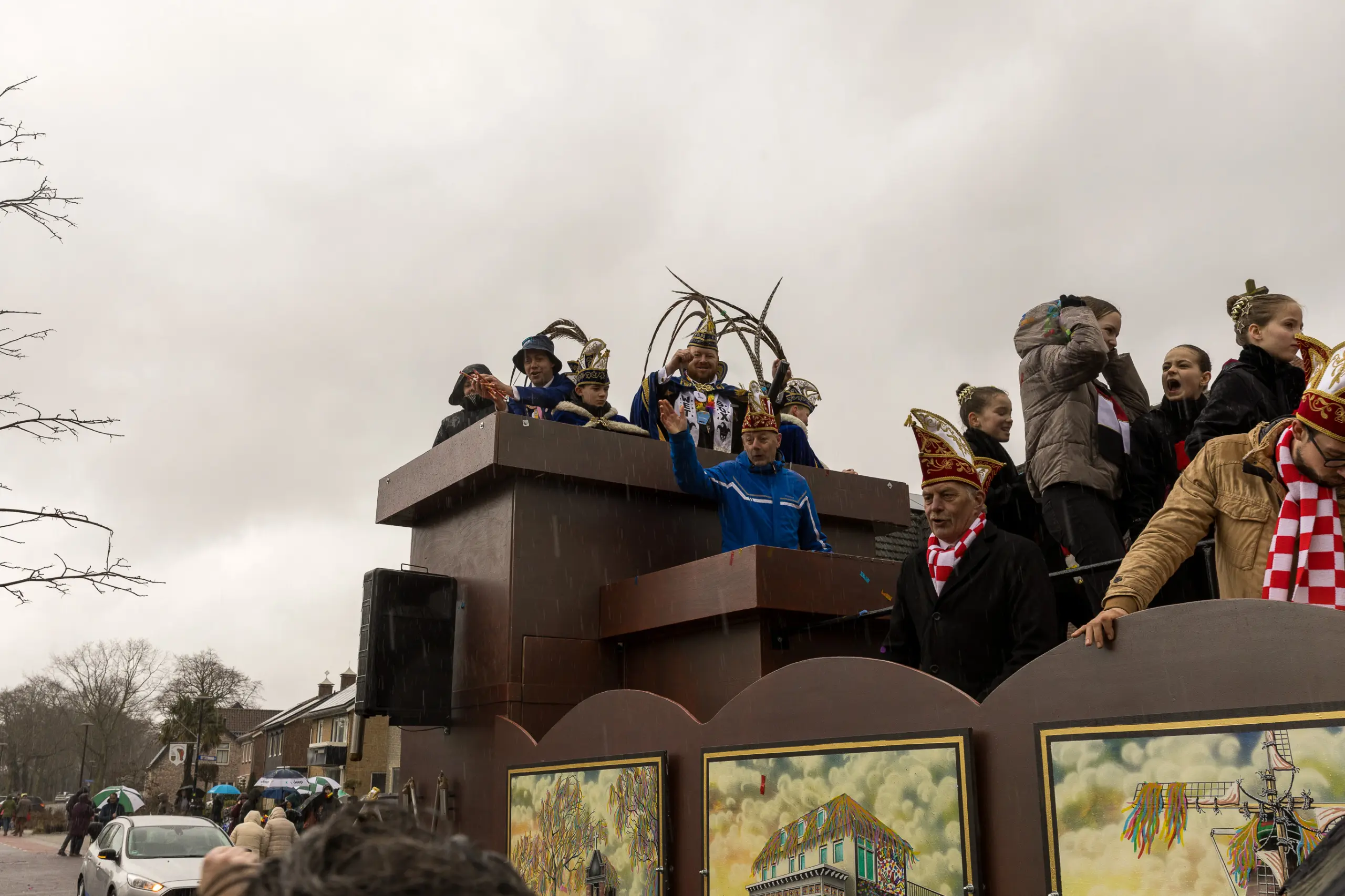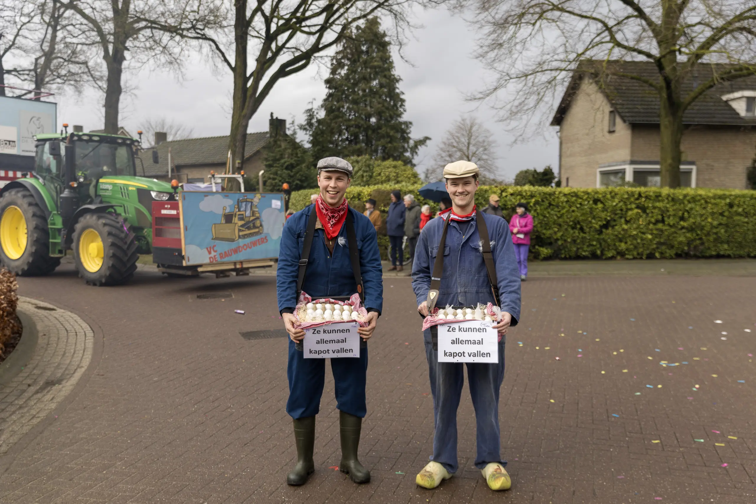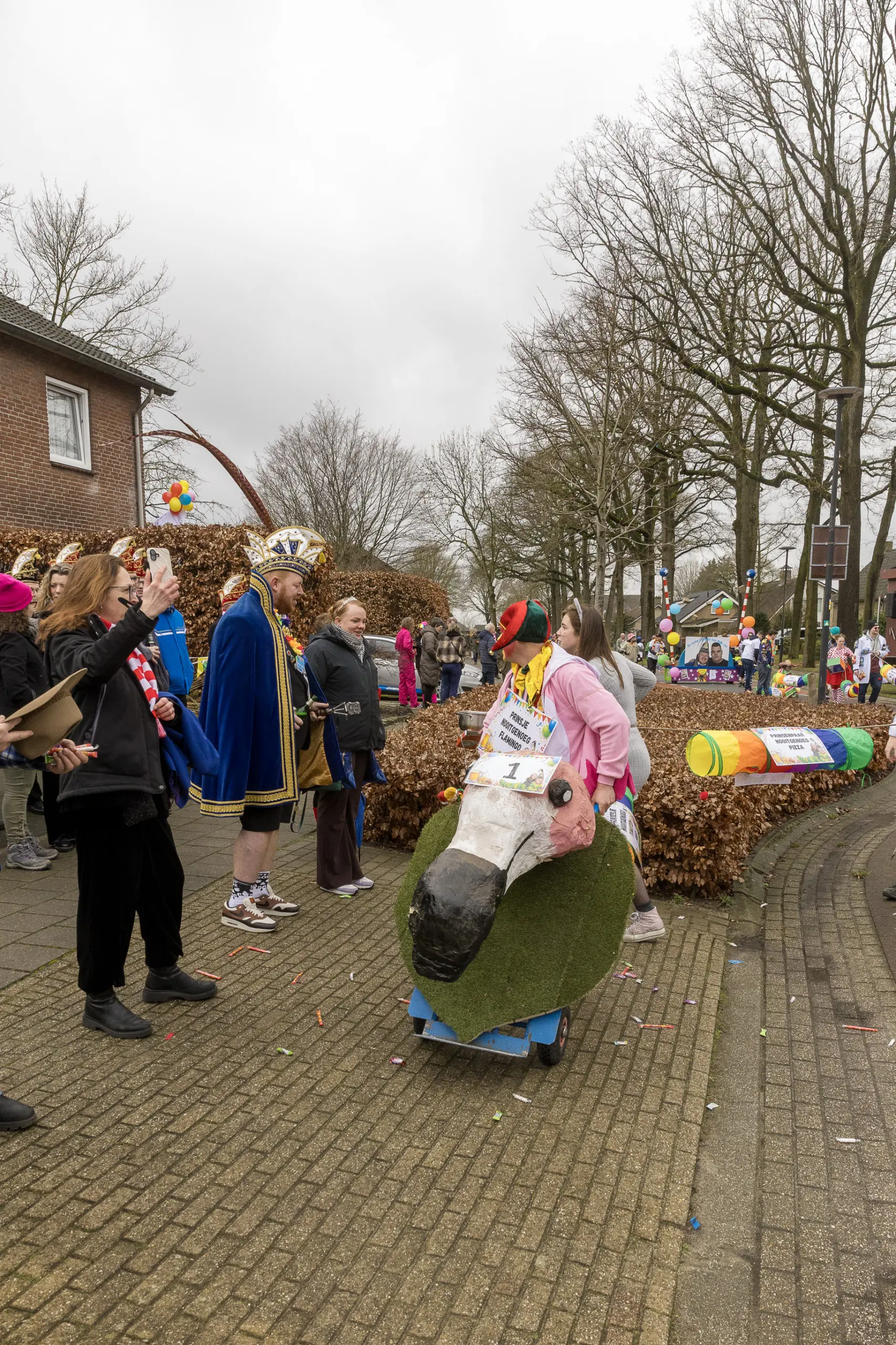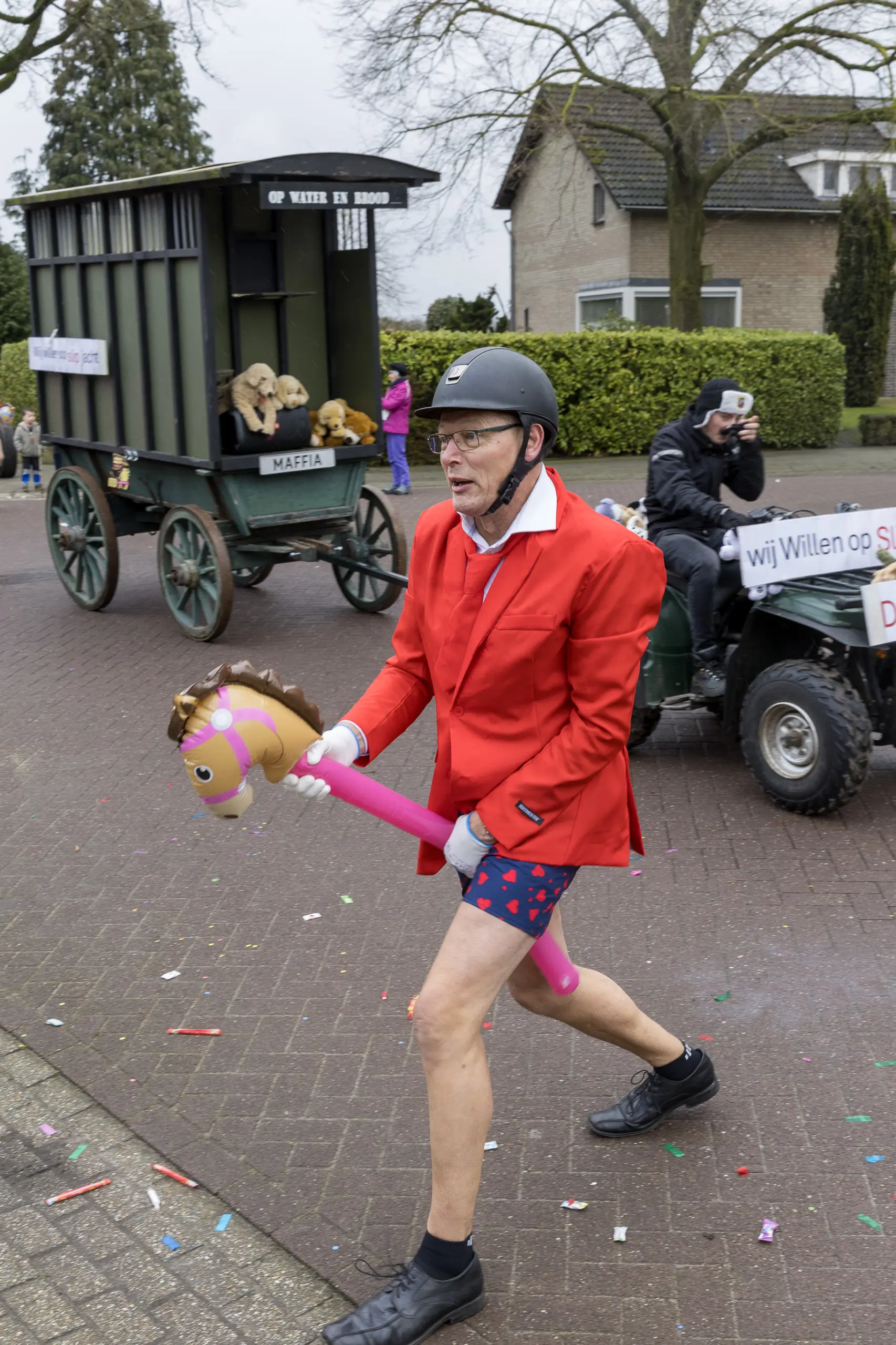 Een stevige hagelbui kon de toeschouwers bij de optocht in Vlierden er maandagmiddag niet van weerhouden de voorbijtrekkende stoet te aanschouwen. Ook de deelnemers lieten zich niet tegenhouden door de zo nu en dan barre weersomstandigheden. Prins ‘nooit genoeg’ Jos had het ondanks zijn kenmerkende korte broek warm genoeg dankzij een flesje bier, maar ook onder andere een tomatensoepje waar hij op werd getrakteerd.