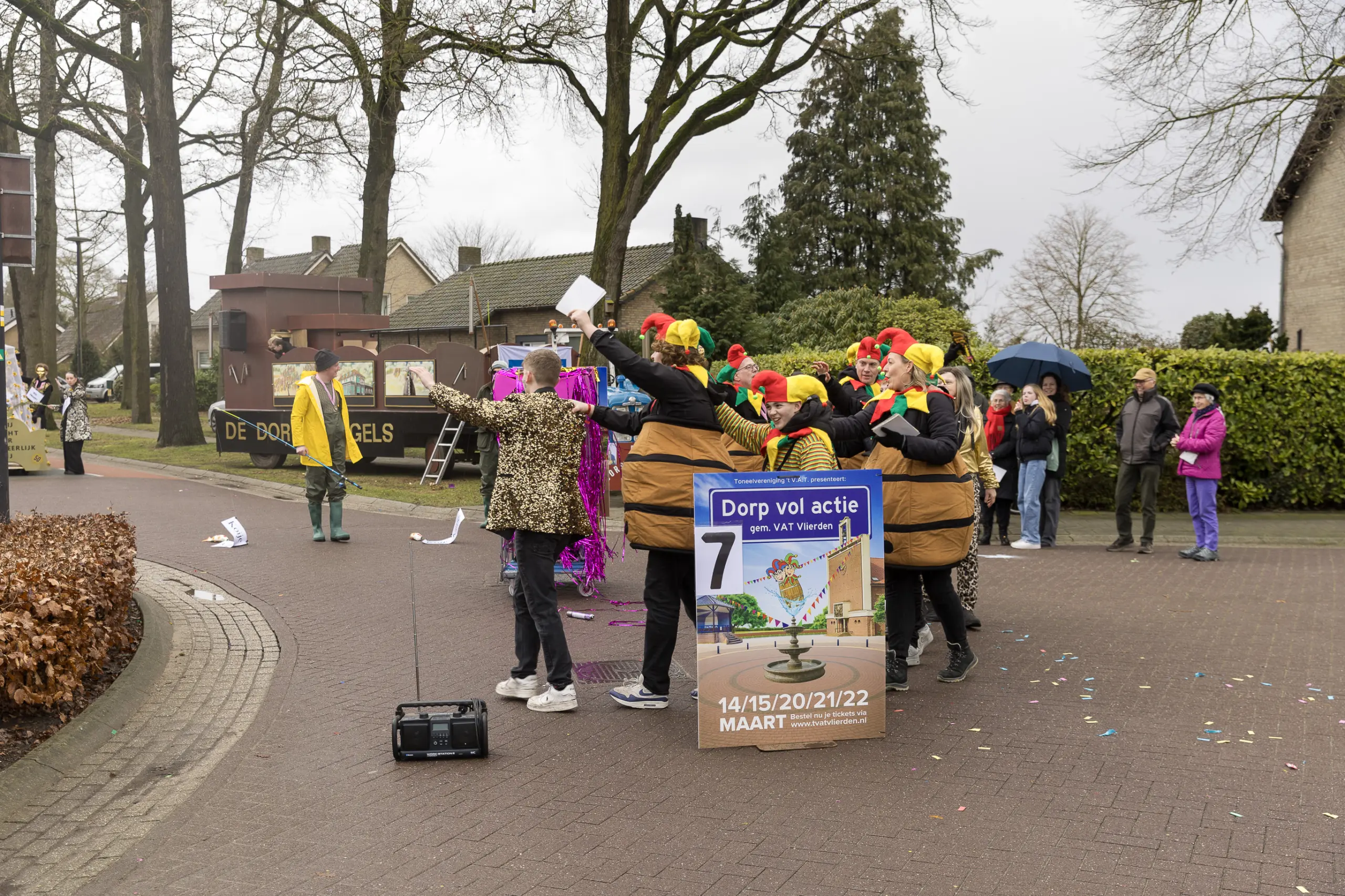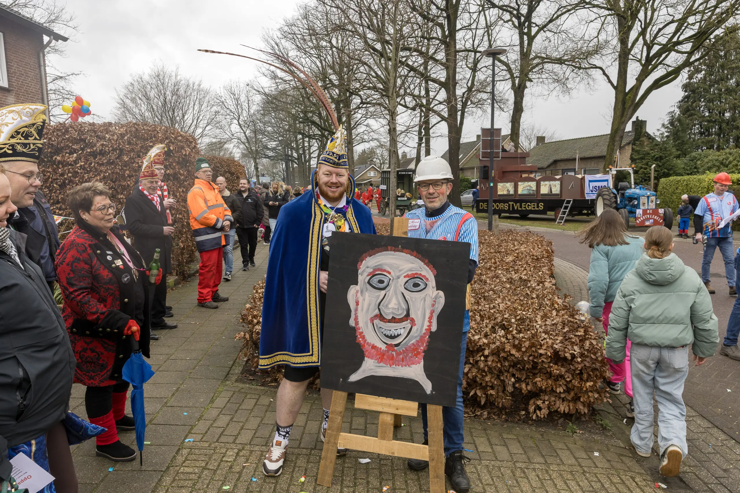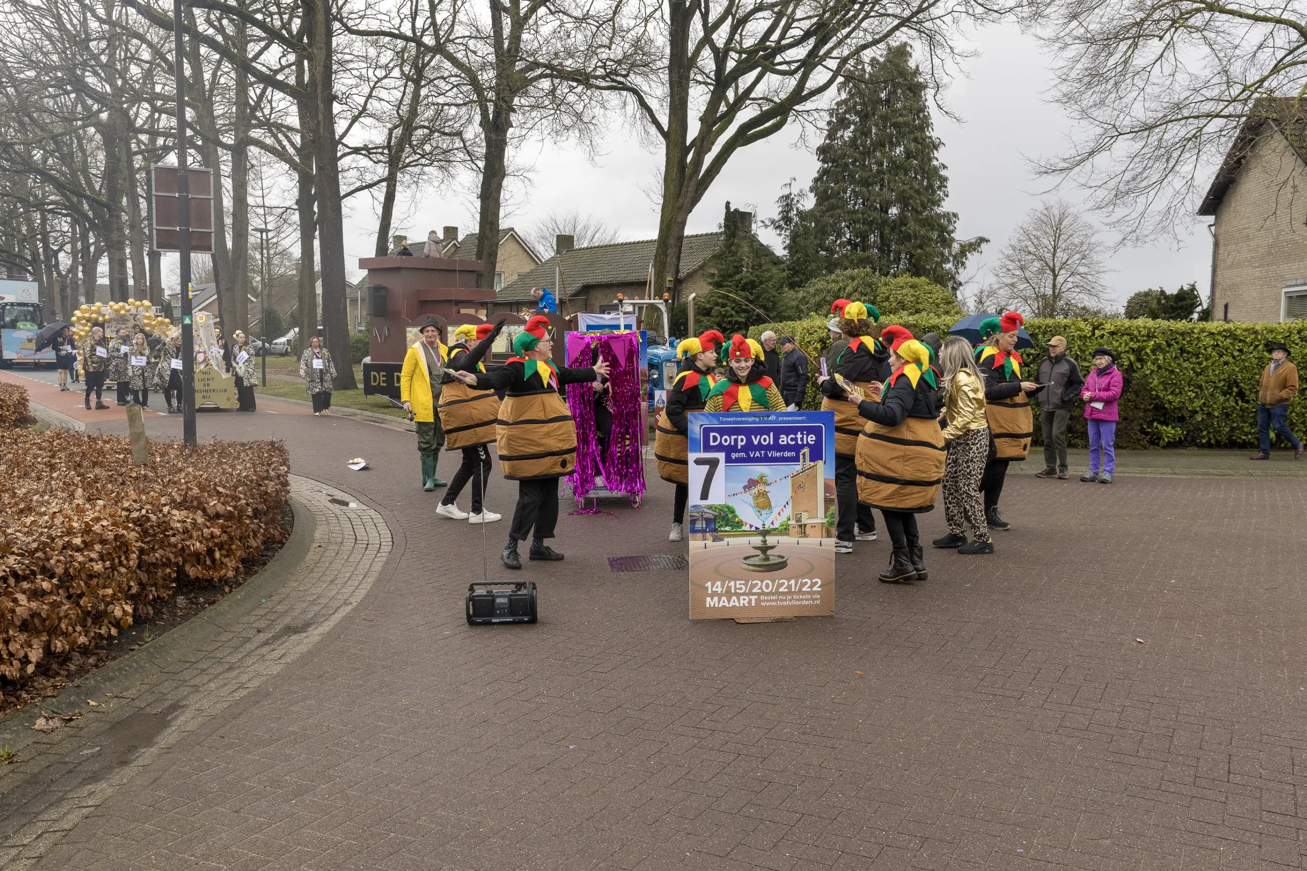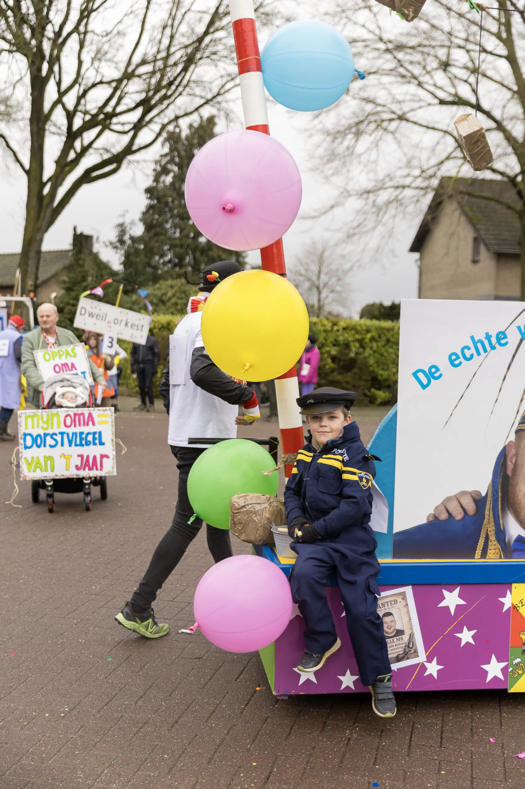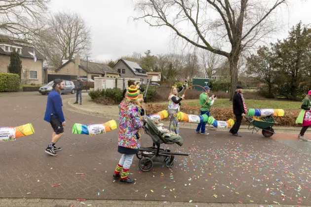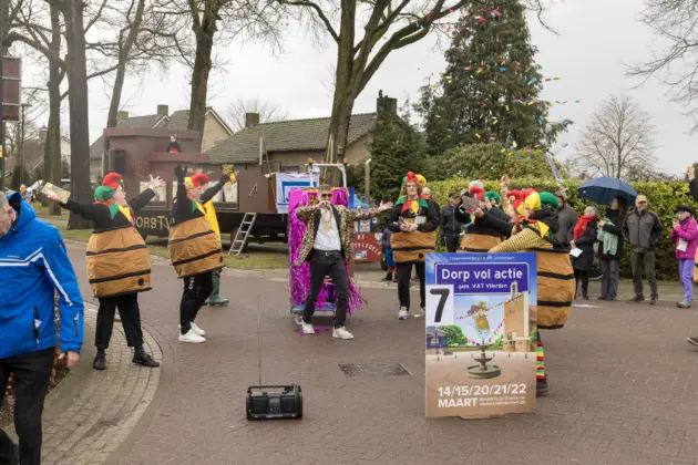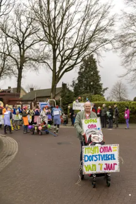 Mario Berkers maakte van een nood een deugd door zijn oppastaak te combineren met deelname aan de optocht. Dat hierbij ook een belangrijke rol was weggelegd voor zijn kleinkind bleek wel uit de tekst op de kinderwagen: ‘Mijn oma is Dorstvlegel van het jaar’. Ook de leden van Toneelvereniging ’t Vat lieten het mes aan twee kanten snijden door in de stoet mee te lopen en meteen hun nieuwe toneelstuk ‘Dorp vol actie’ te promoten dat ze volgende maand vijf keer gaan uitvoeren.