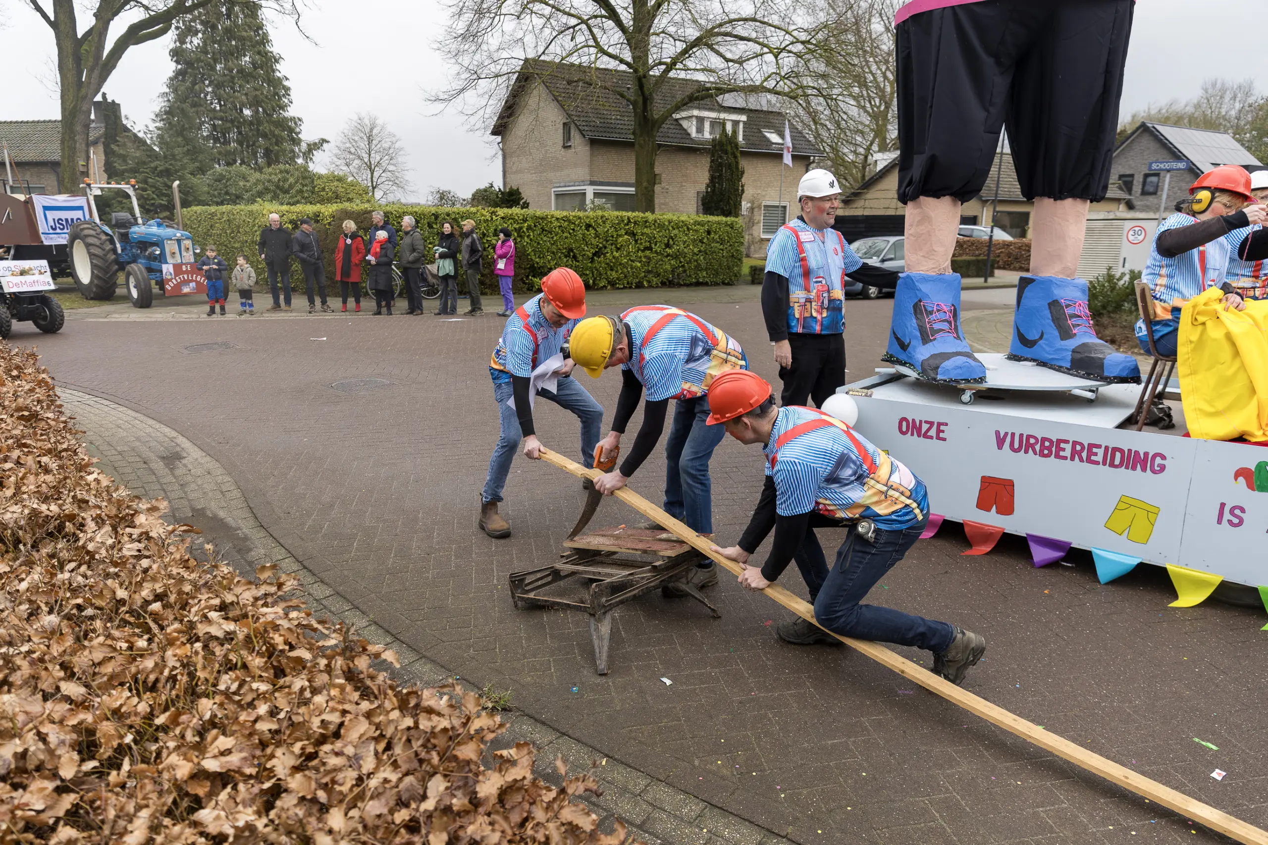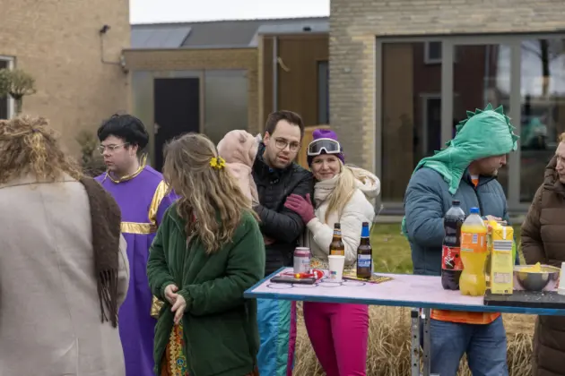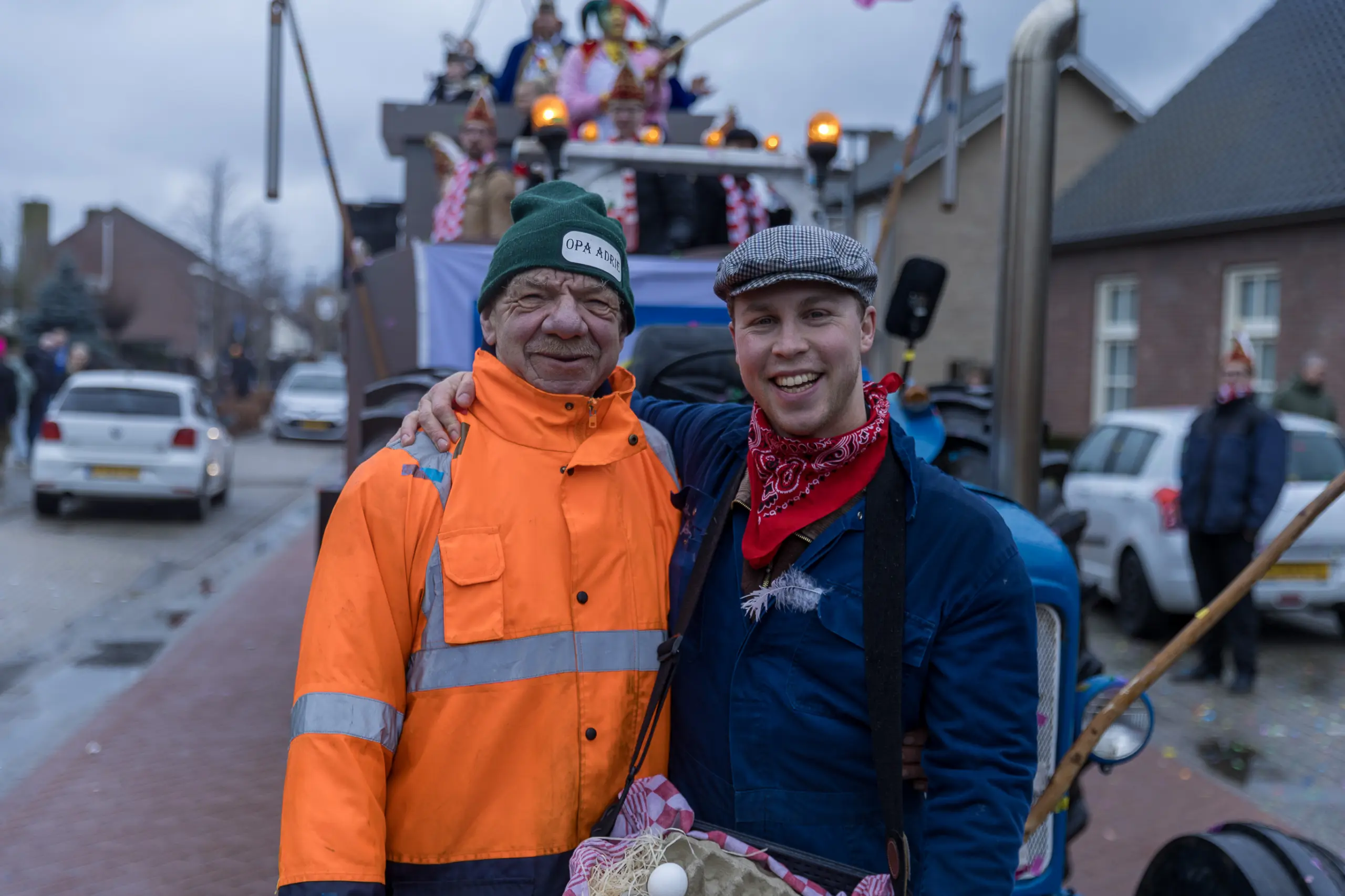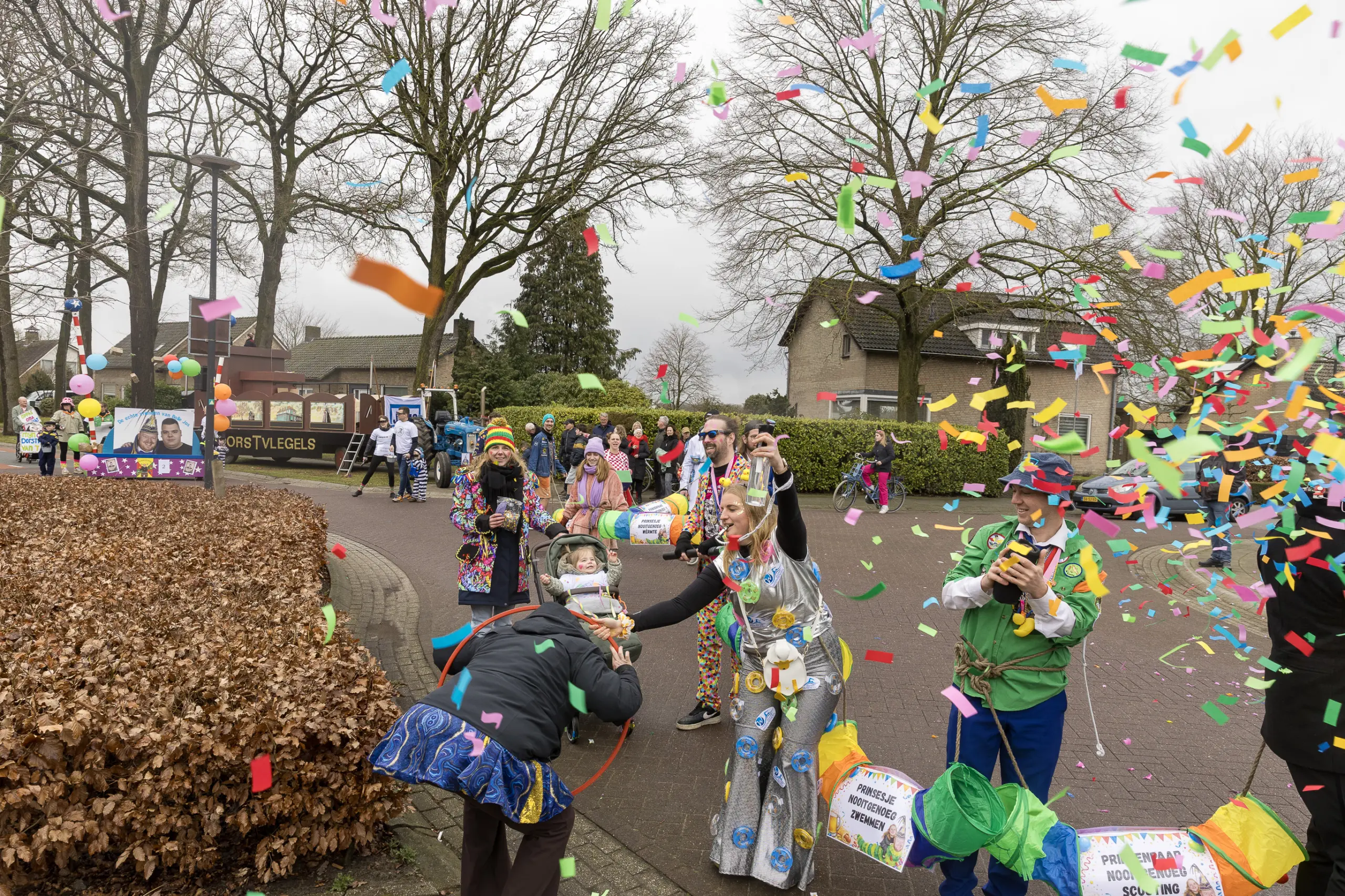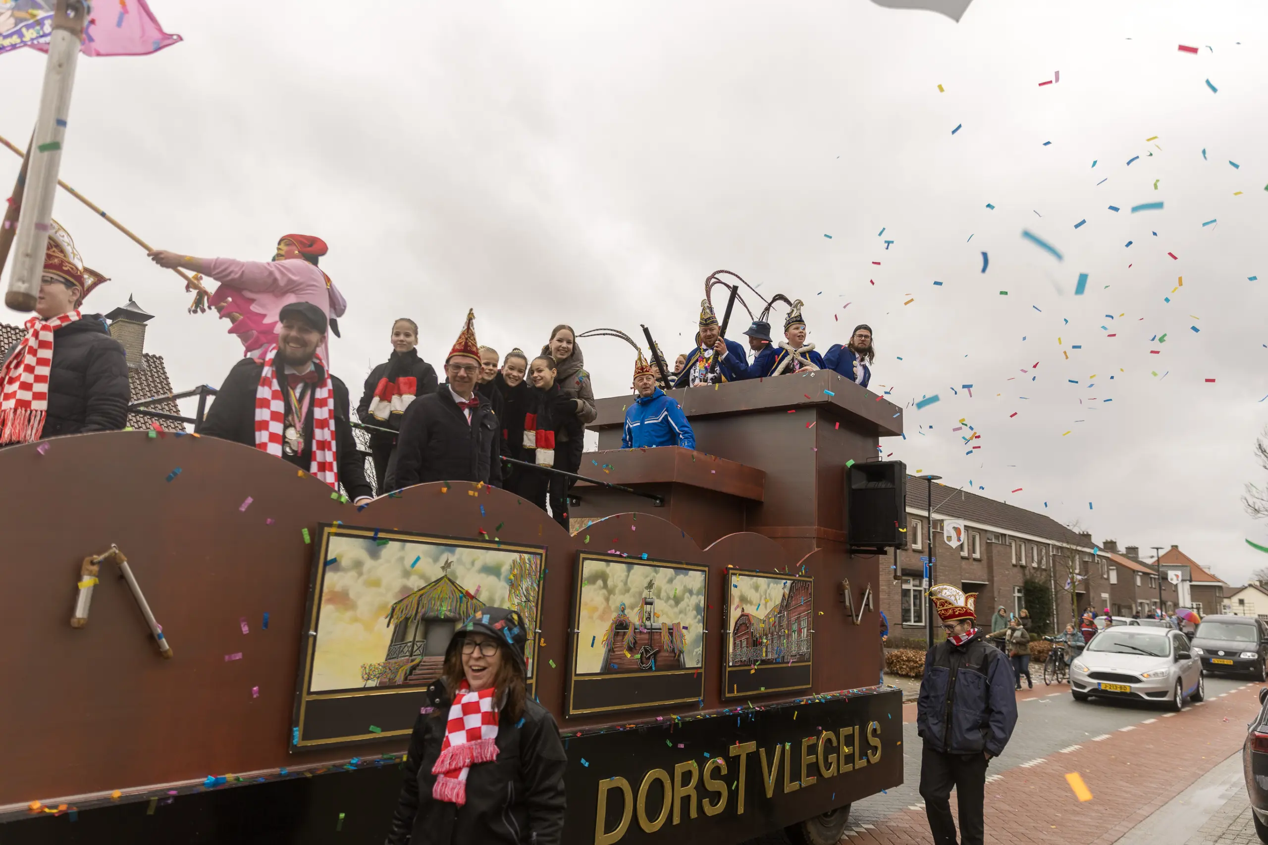 Mario Berkers maakte van een nood een deugd door zijn oppastaak te combineren met deelname aan de optocht. Dat hierbij ook een belangrijke rol was weggelegd voor zijn kleinkind bleek wel uit de tekst op de kinderwagen: ‘Mijn oma is Dorstvlegel van het jaar’. Ook de leden van Toneelvereniging ’t Vat lieten het mes aan twee kanten snijden door in de stoet mee te lopen en meteen hun nieuwe toneelstuk ‘Dorp vol actie’ te promoten dat ze volgende maand vijf keer gaan uitvoeren.