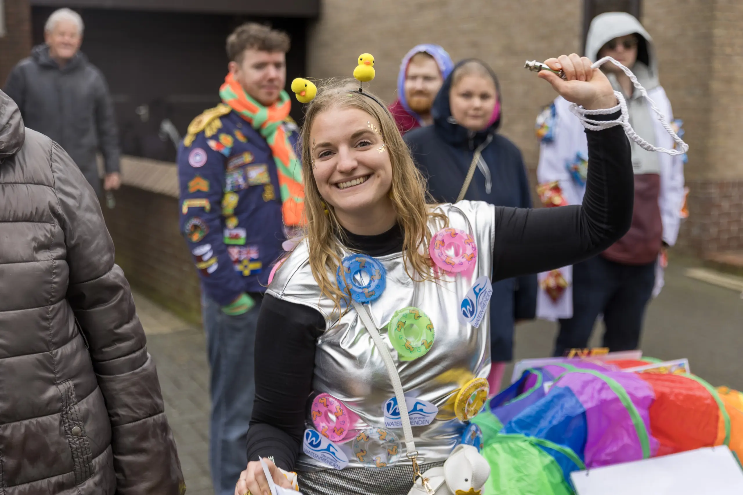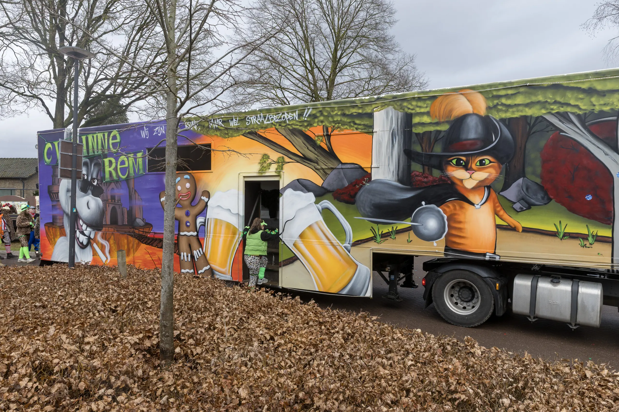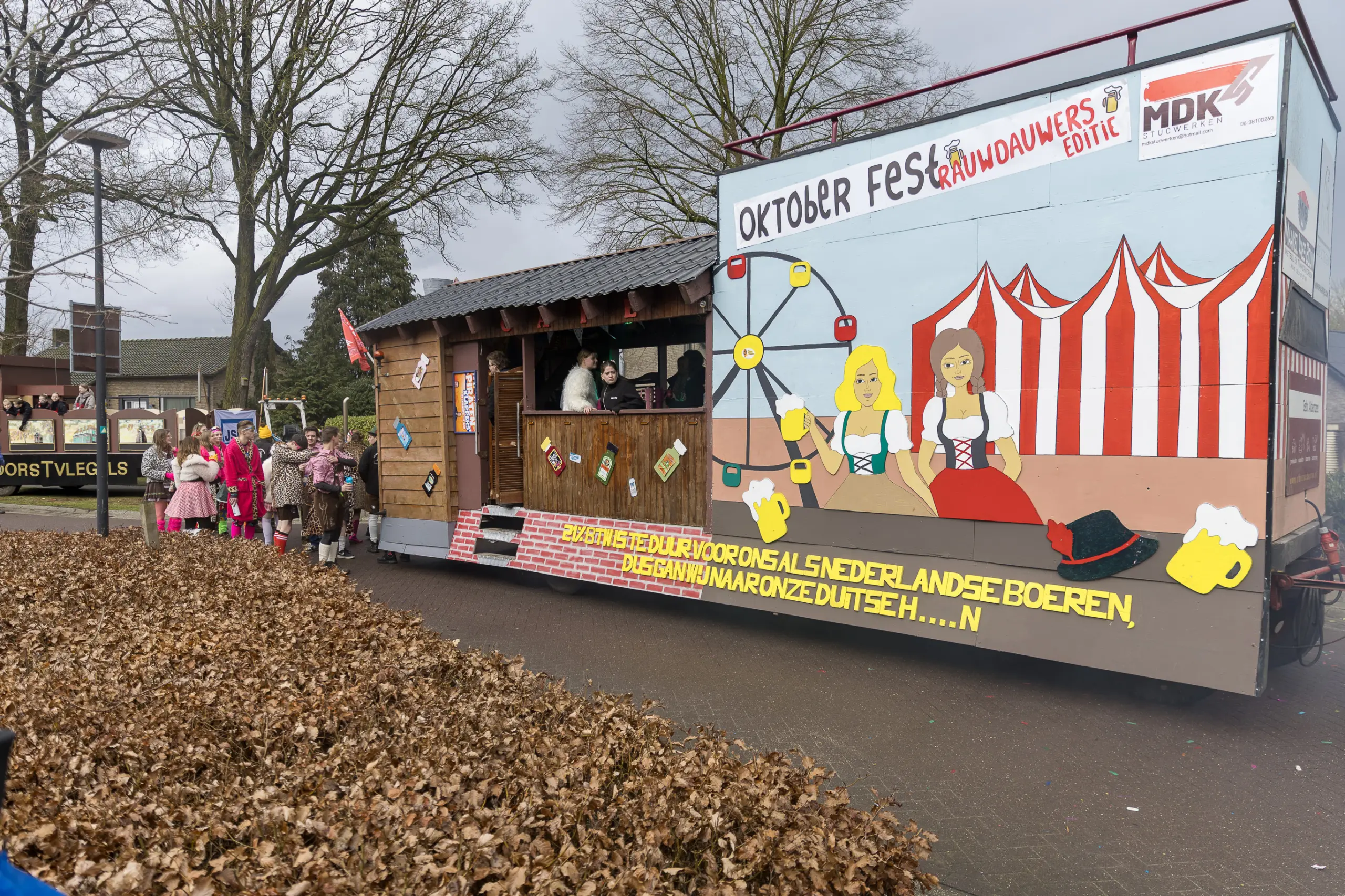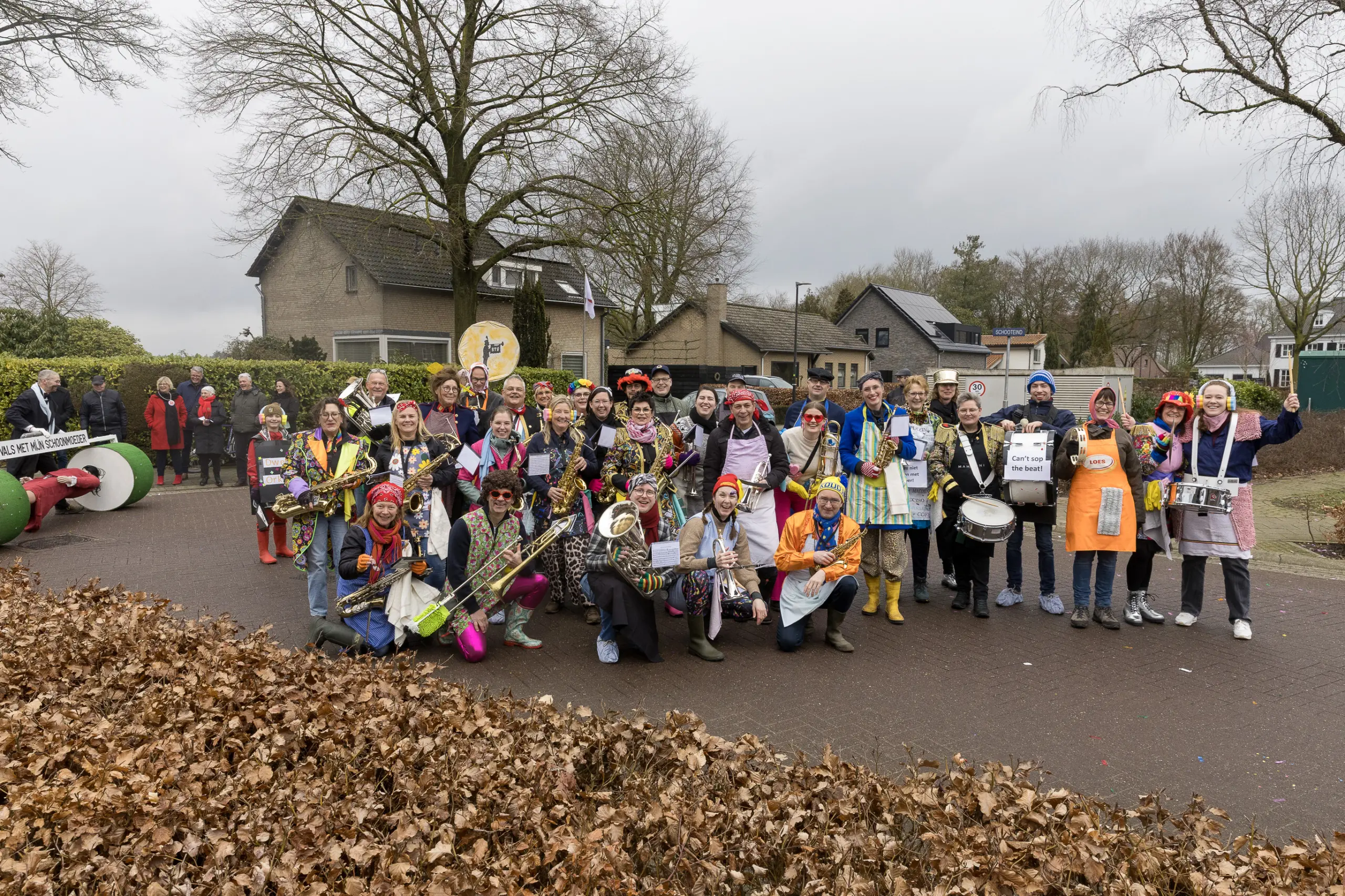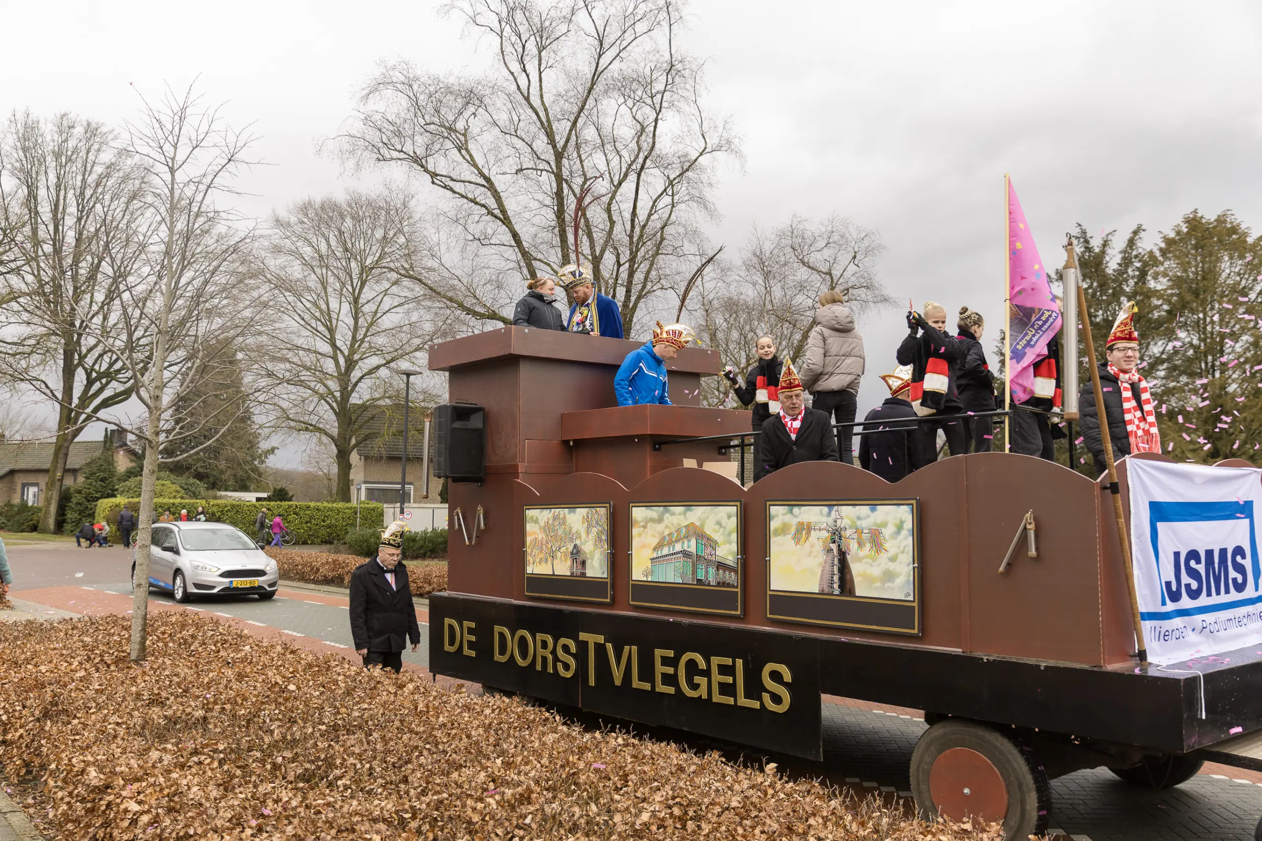 Mario Berkers maakte van een nood een deugd door zijn oppastaak te combineren met deelname aan de optocht. Dat hierbij ook een belangrijke rol was weggelegd voor zijn kleinkind bleek wel uit de tekst op de kinderwagen: ‘Mijn oma is Dorstvlegel van het jaar’. Ook de leden van Toneelvereniging ’t Vat lieten het mes aan twee kanten snijden door in de stoet mee te lopen en meteen hun nieuwe toneelstuk ‘Dorp vol actie’ te promoten dat ze volgende maand vijf keer gaan uitvoeren.