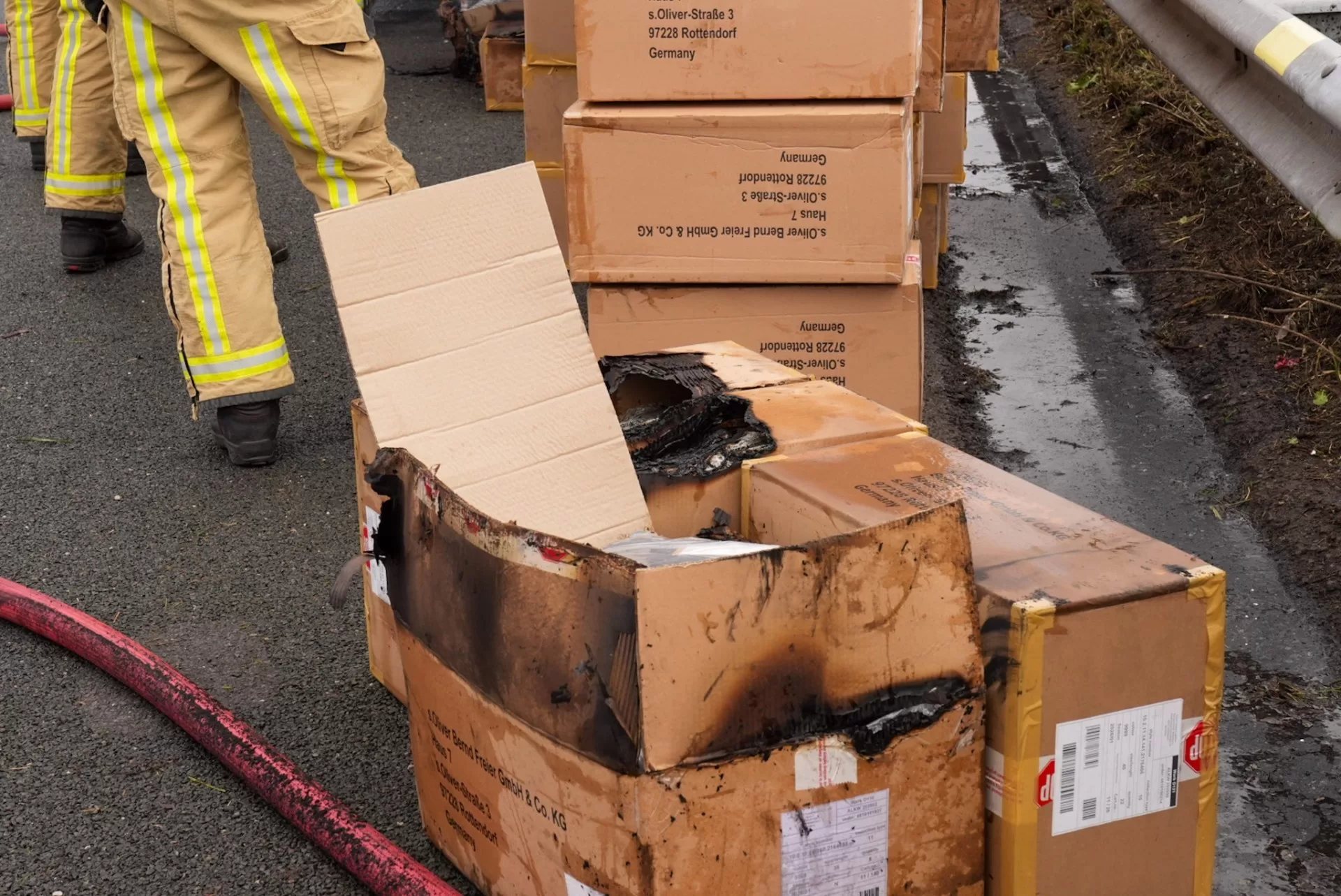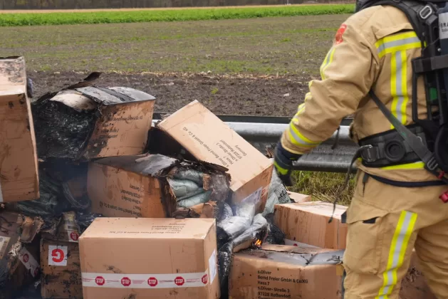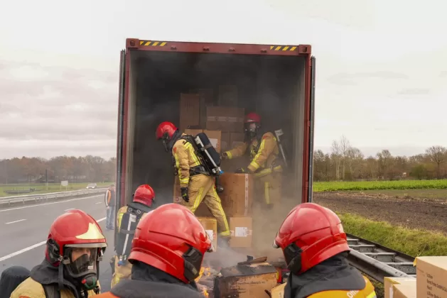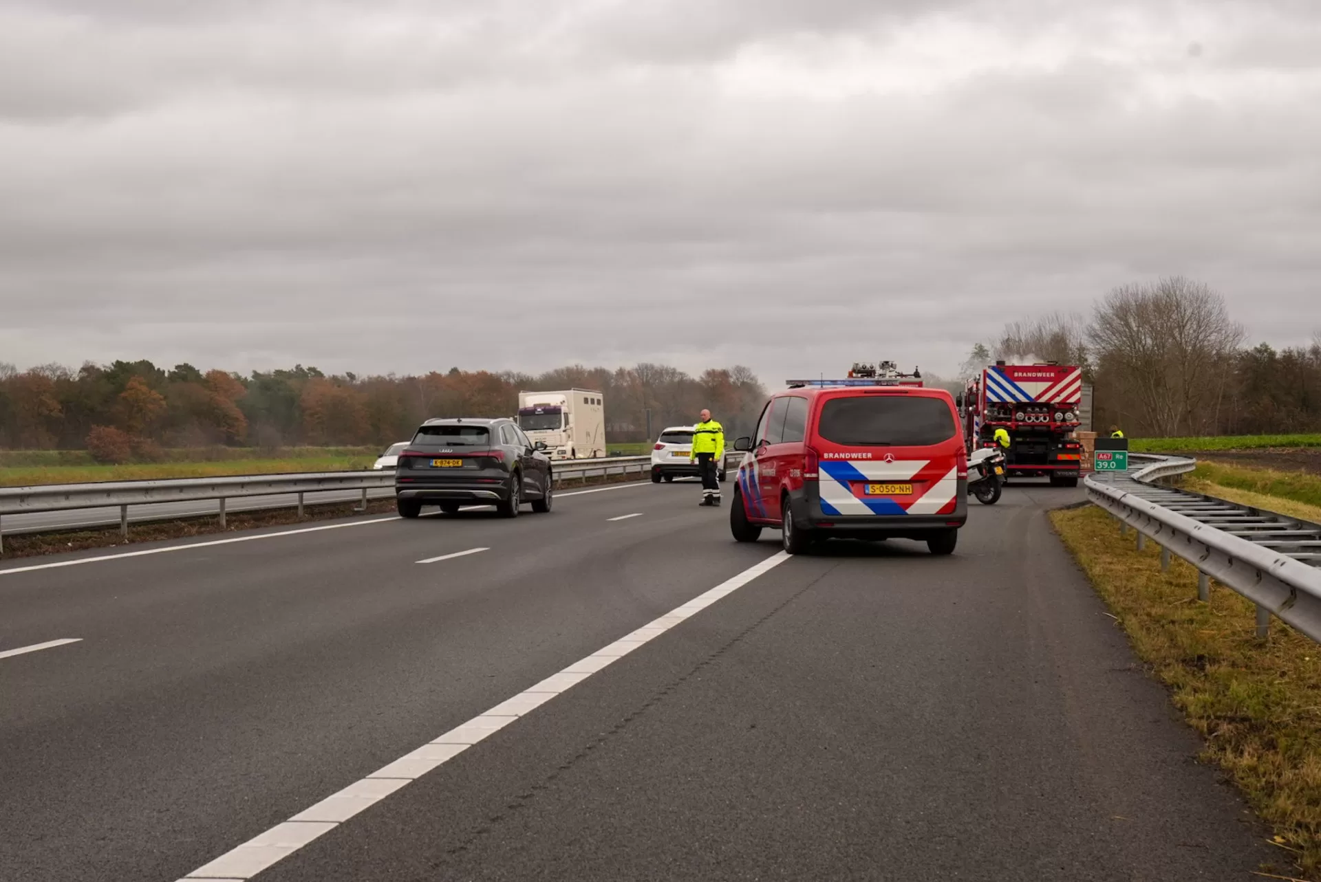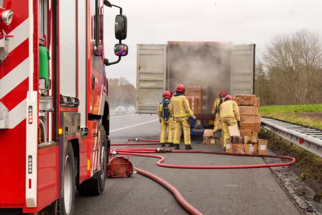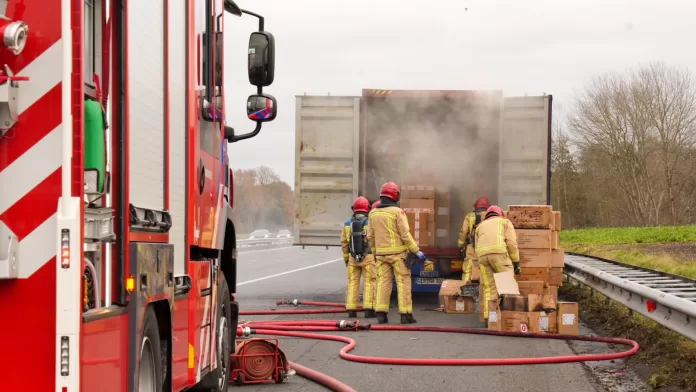 De chauffeur heeft zijn voertuig ter hoogte van de afslag Asten op de vluchtstrook geparkeerd toen hij merkte dat er rook uit de aanhanger kwam. De brandweer heeft de container losgekoppeld van de truck en is bezig de dozen uit te laden om zo de brand te kunnen blussen.
